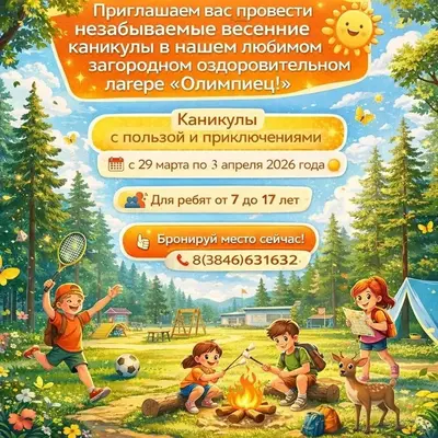 Совсем скоро весна! С каждым днем солнце светит ярче, а у школьников приближаются долгожданные весенние каникулы — отличное время для отдыха после самой длинной учебной четверти. Уже сейчас стоит задуматься, как наполнить свободные дни яркими впечатлениями! Загородный лагерь «Олимпиец» приглашает ребят от 7 до 17 лет провести каникулы активно, весело